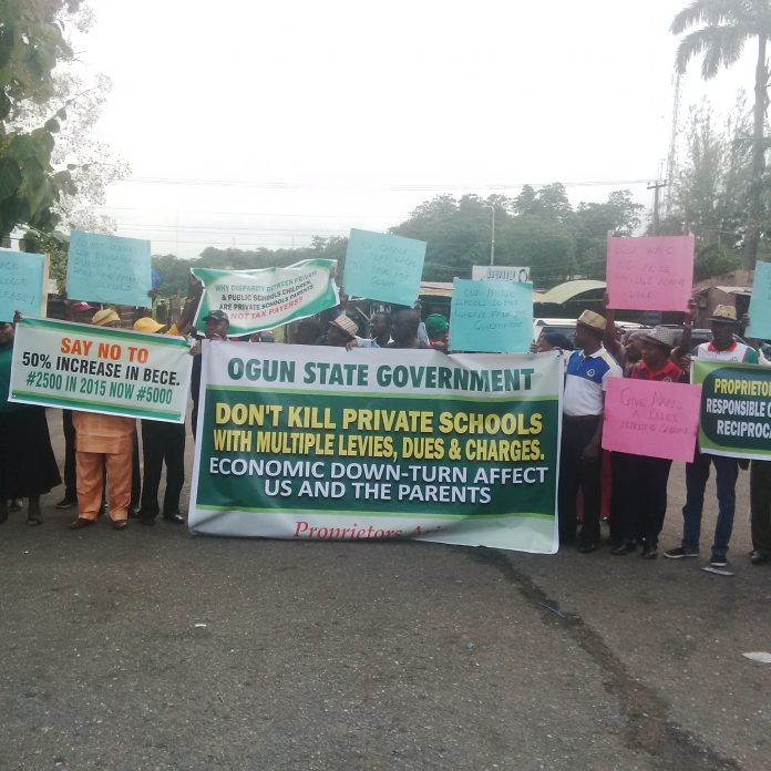 Private school owners in Ogun State on Wednesday protested over alleged multiple levies and charges by the state government.