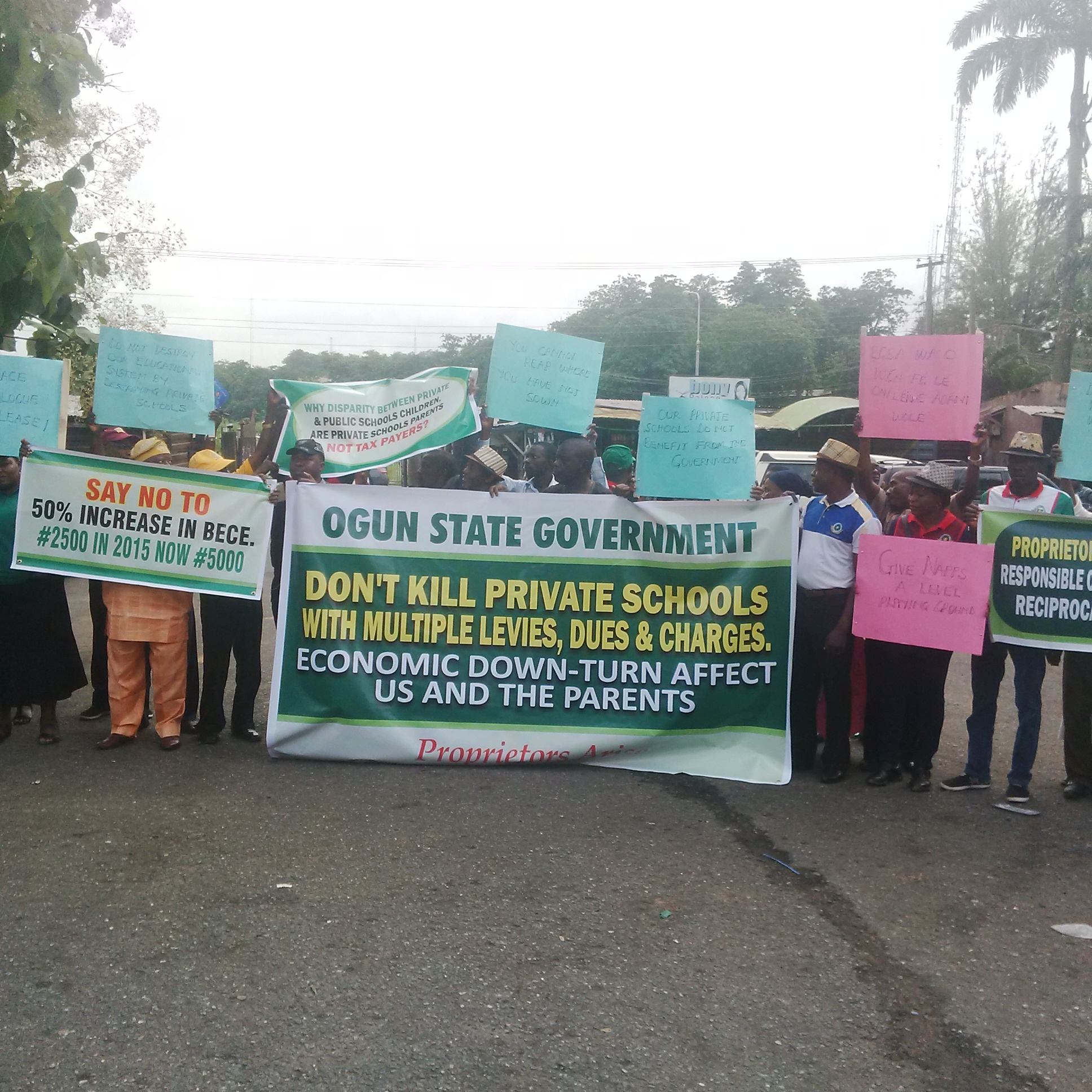 Scores of the private schools owners under the aegis of National Association of Proprietors of Private Schools, Ogun chapter, stormed the Nigeria Union of Journalists Secretariat, Oke Ilewo, Abeokuta protesting against the more than 150 per cent increase in the charges for the First School Leaving Certificate examination.
